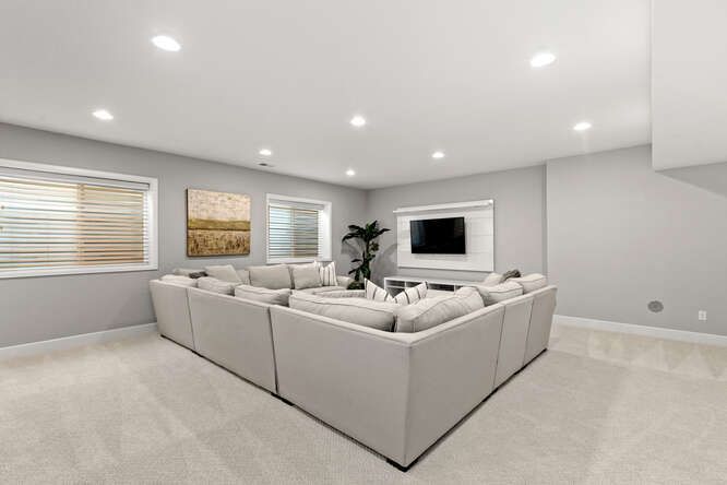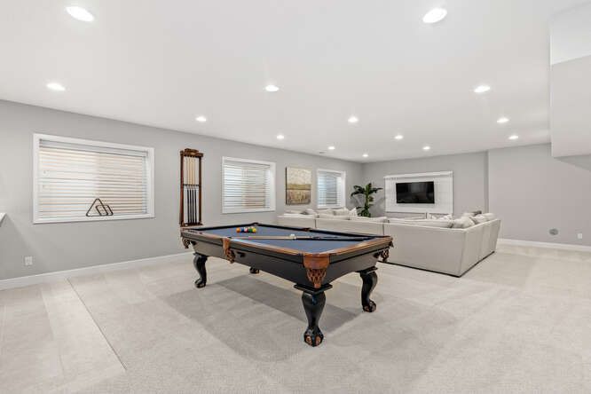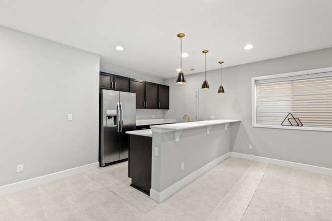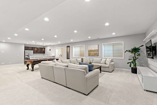 Finished lower level, with new carpet, showcases a large and versatile family room and rec room that includes a large, walk-behind bar with all the amenities. Bar features a full size refrigerator, additional beverage fridge, bar sink, ample storage and bar top seating. Lower level also includes a large bedroom with a walk-in closet and a spacious bathroom with a glass enclosed shower.