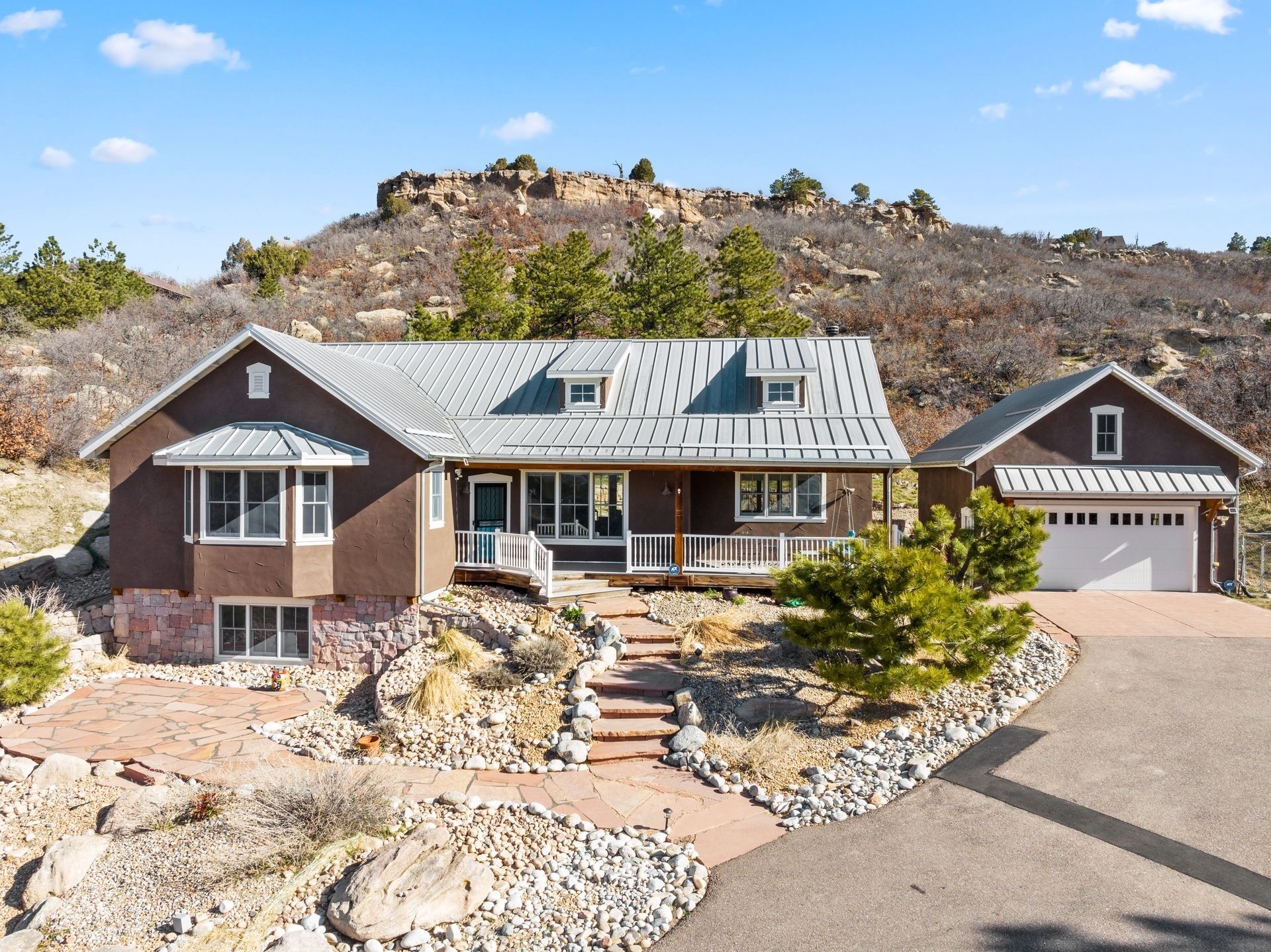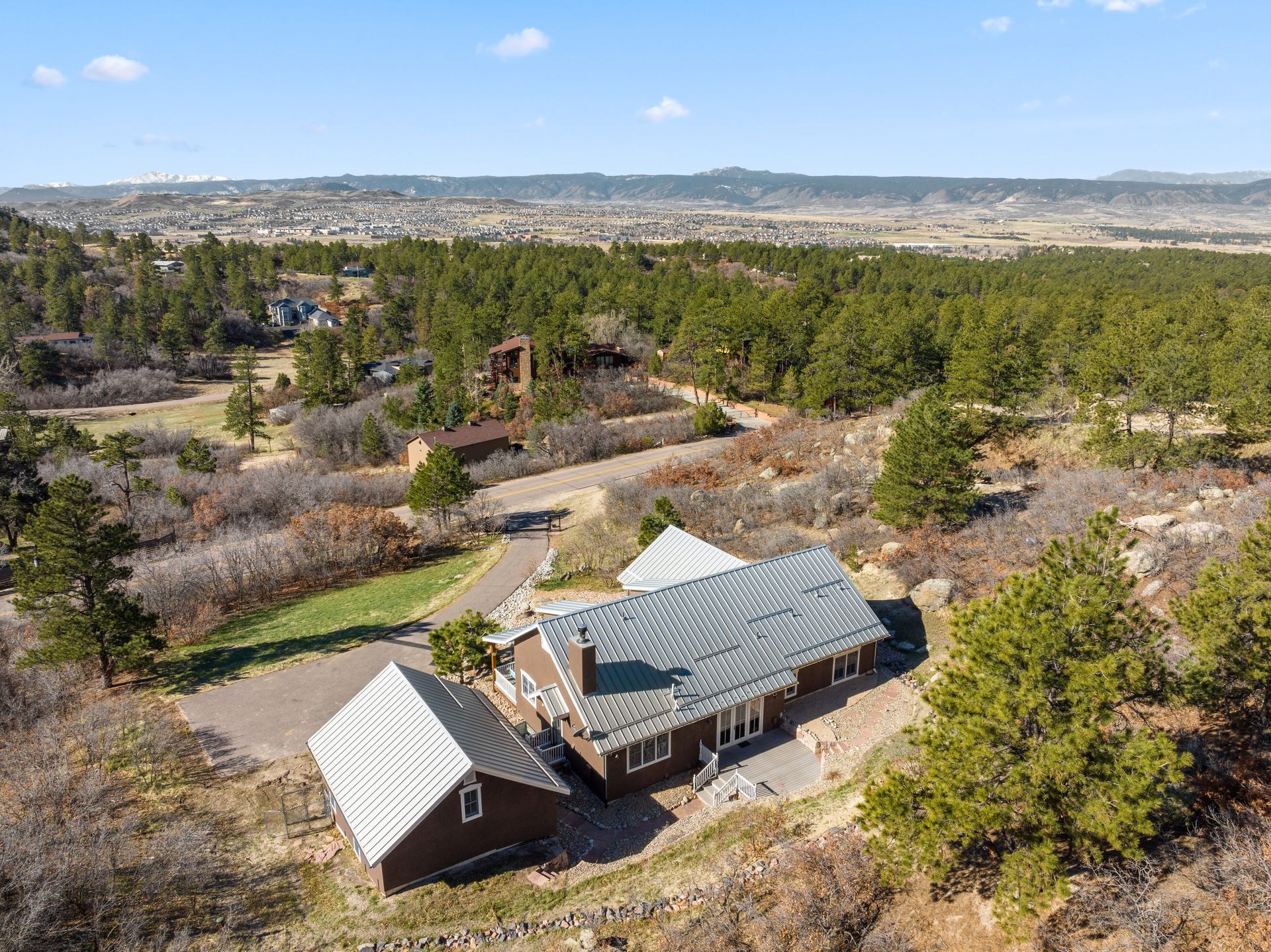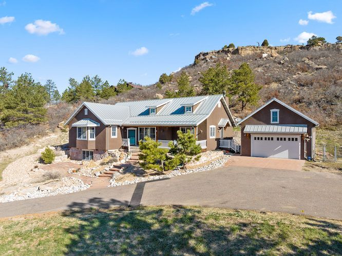 As you step inside, you'll be greeted by an open floor plan featuring a living room, dining room, hearth room, and large kitchen. The living area boasts a cozy fireplace, hand-troweled walls, wood beams throughout, Mexican tile flooring, and a Southwest flare. Outside, you'll find a gated driveway leading to a 2-car oversized detached garage with a large room above, perfect for a workout room or studio. Enjoy the outdoors with a composite deck, a front porch with a swing boasting breathtaking views of Pikes Peak, and an area for a hot tub with a hot tub outlet. This property also comes with the additional perks of no HOA and abundant wildlife, from deer to turkeys to soaring hawks. The large basement has the perfect recreation room and a large storage area. Embrace the Colorado lifestyle with this rare find in the Happy Canyon neighborhood. Don't miss the opportunity to call this private retreat your home sweet home. Schedule your showing today!