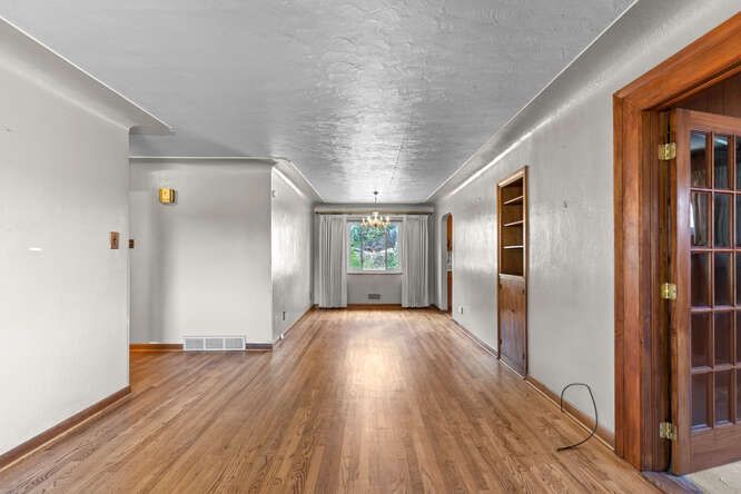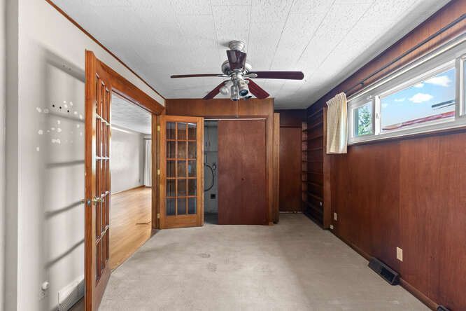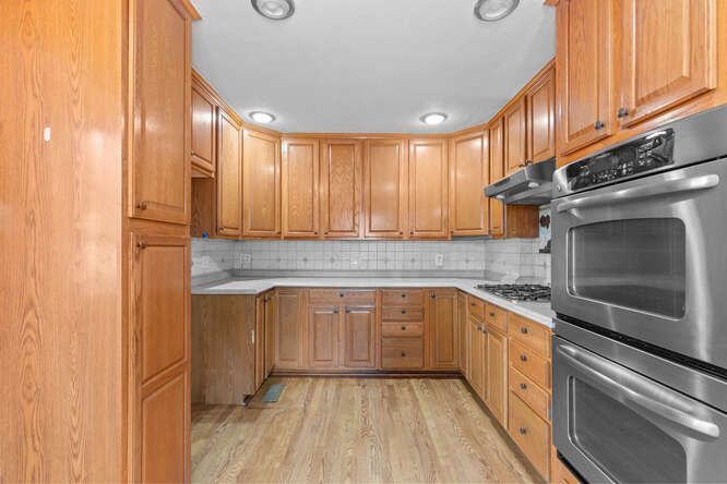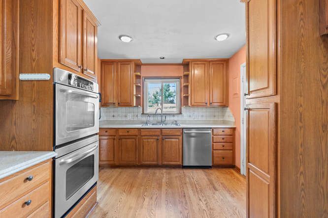 Greeted by the warmth of hardwood floors that leads you through an inviting layout that includes three bedrooms, a den, kitchen, living room, dining room and a full bathroom. Built in 1955, you'll find natural light, built-in bookshelves, french doors and a wood burning fireplace. The heart of the home features a kitchen equipped with a gas cooktop with stainless steel hood, double ovens, stainless sink and dishwasher and an abundance of storage space, perfect for culinary enthusiasts who appreciate efficient cooking spaces.