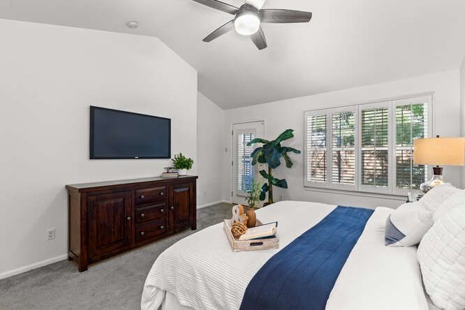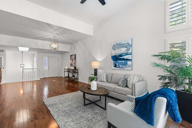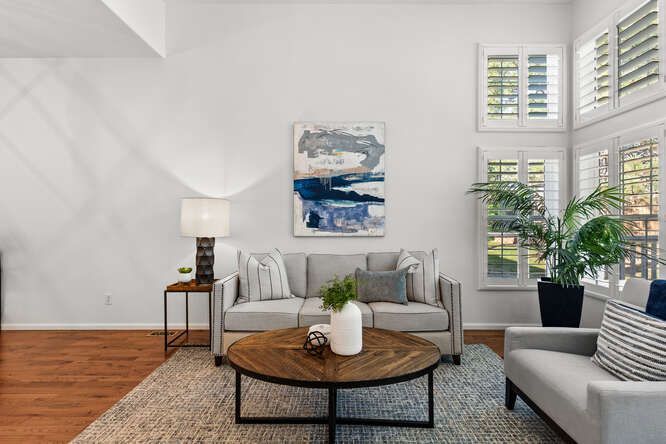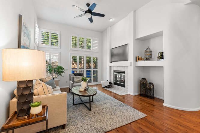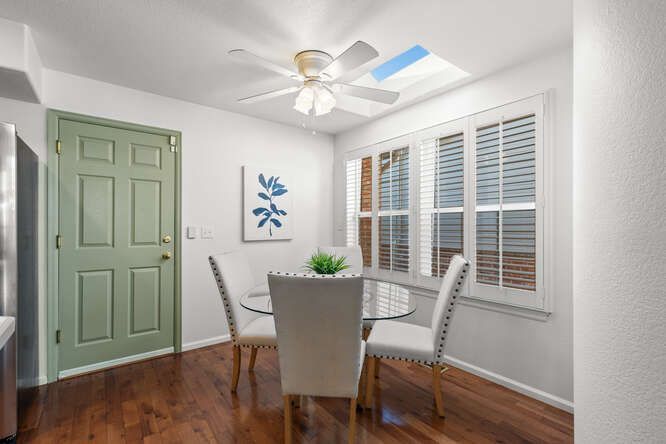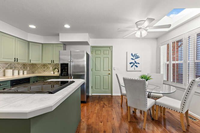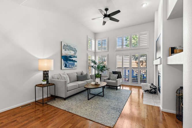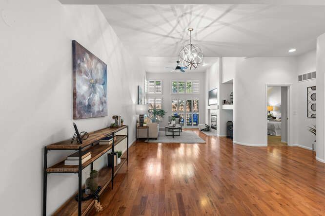 A low maintenance lifestyle in Lone Tree awaits at 9491 Southern Hills Circle. This move-in ready, ranch style condo, features gleaming hardwood floors, new interior paint on the main level, elegant plantation shutters, vaulted ceilings and is filled with natural light. The open foyer and family room includes a gas fireplace with tile surround, a skylight, convenient powderoom and glass sliding doors that lead to a private sundeck. The dine-in kitchen includes stainless steel appliances, a center island with new glass cooktop and a breakfast nook and a second skylight. The main level primary suite showcases vaulted ceilings, private access to the back deck, custom walk-in closet, and a 5-piece bath with dual sinks, large soaking tub and a glass enclosed shower.