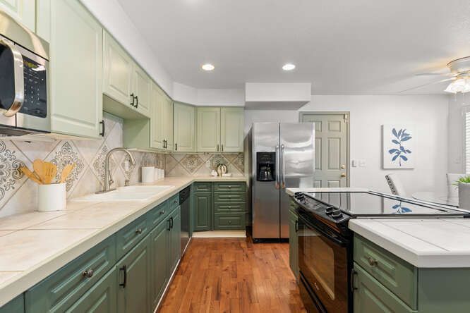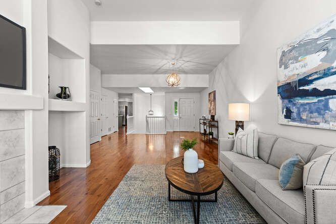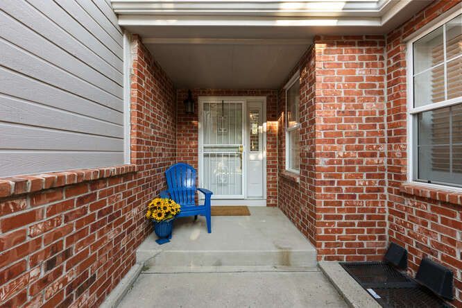A two-car attached garage includes a workbench and built-in storage cabinets. Washer and dryer are included. Exterior maintenance, plus snow removal is covered by the HOA.