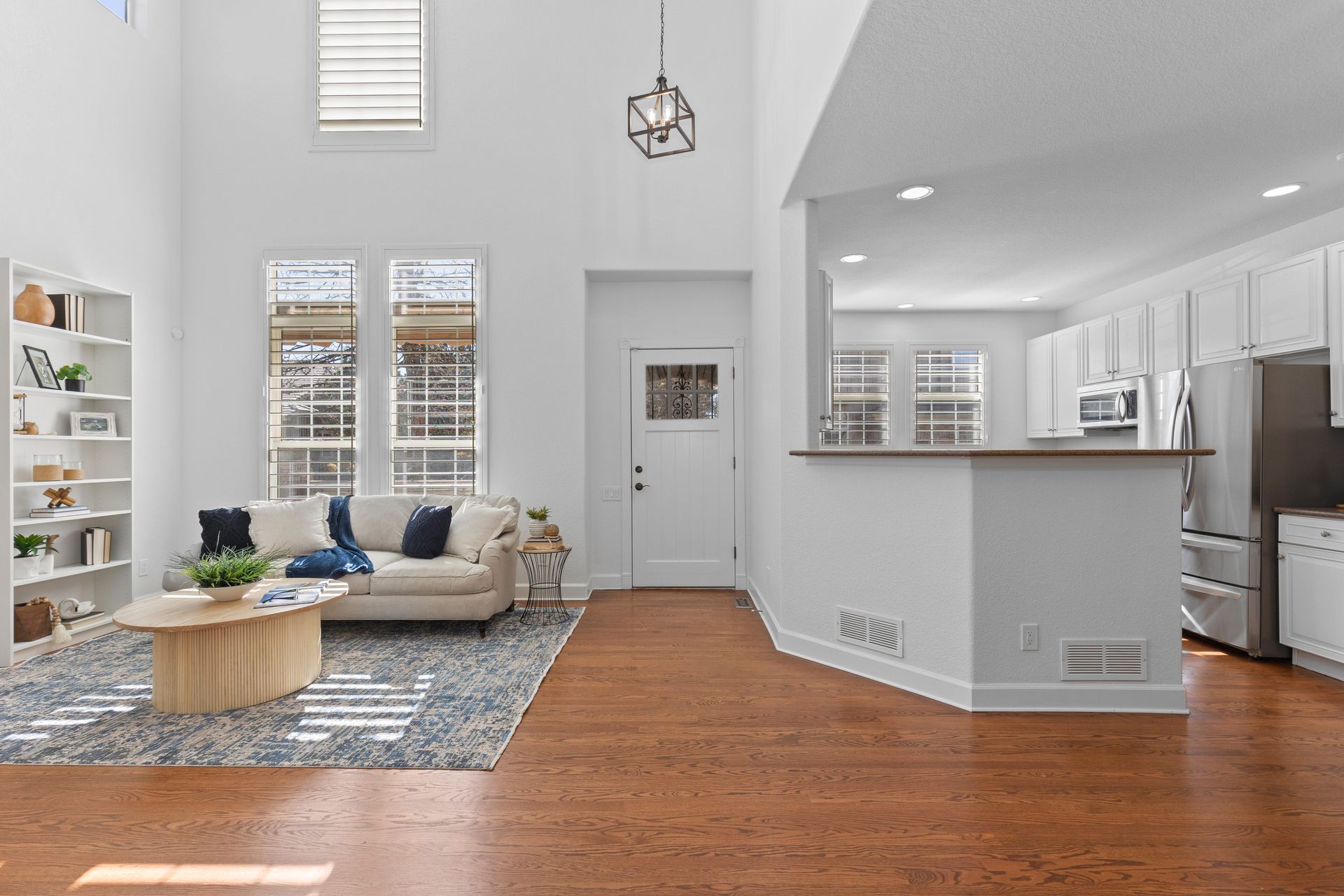 Step inside to find a bright, open floor plan highlighted by towering vaulted ceilings, new hardwood floors on the main level, fresh interior paint, and plantation shutters throughout. The inviting living room features a cozy gas fireplace and flows seamlessly into the dining area and kitchen - ideal for entertaining or quiet evenings at home. The chef-inspired kitchen shines with new stainless-steel appliances,