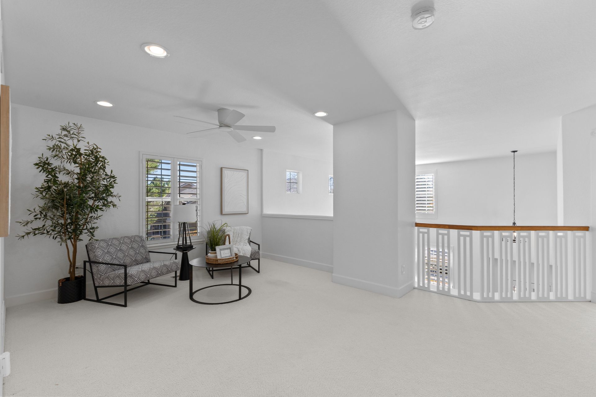 Upstairs, new carpet, ceiling fans, and LED lighting enhance every space. The open loft serves as a perfect home office, reading nook,