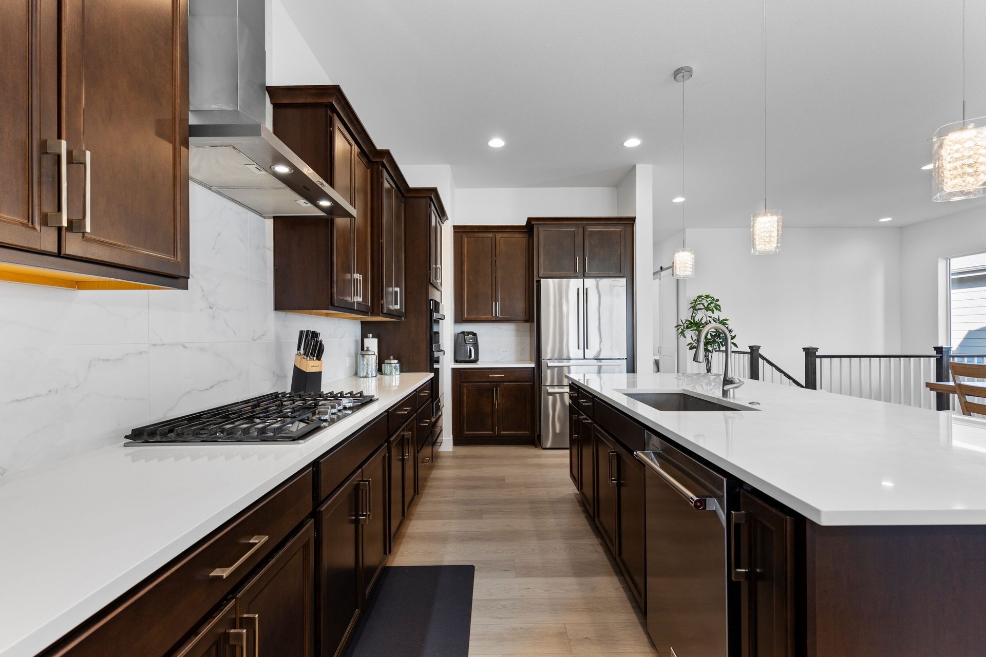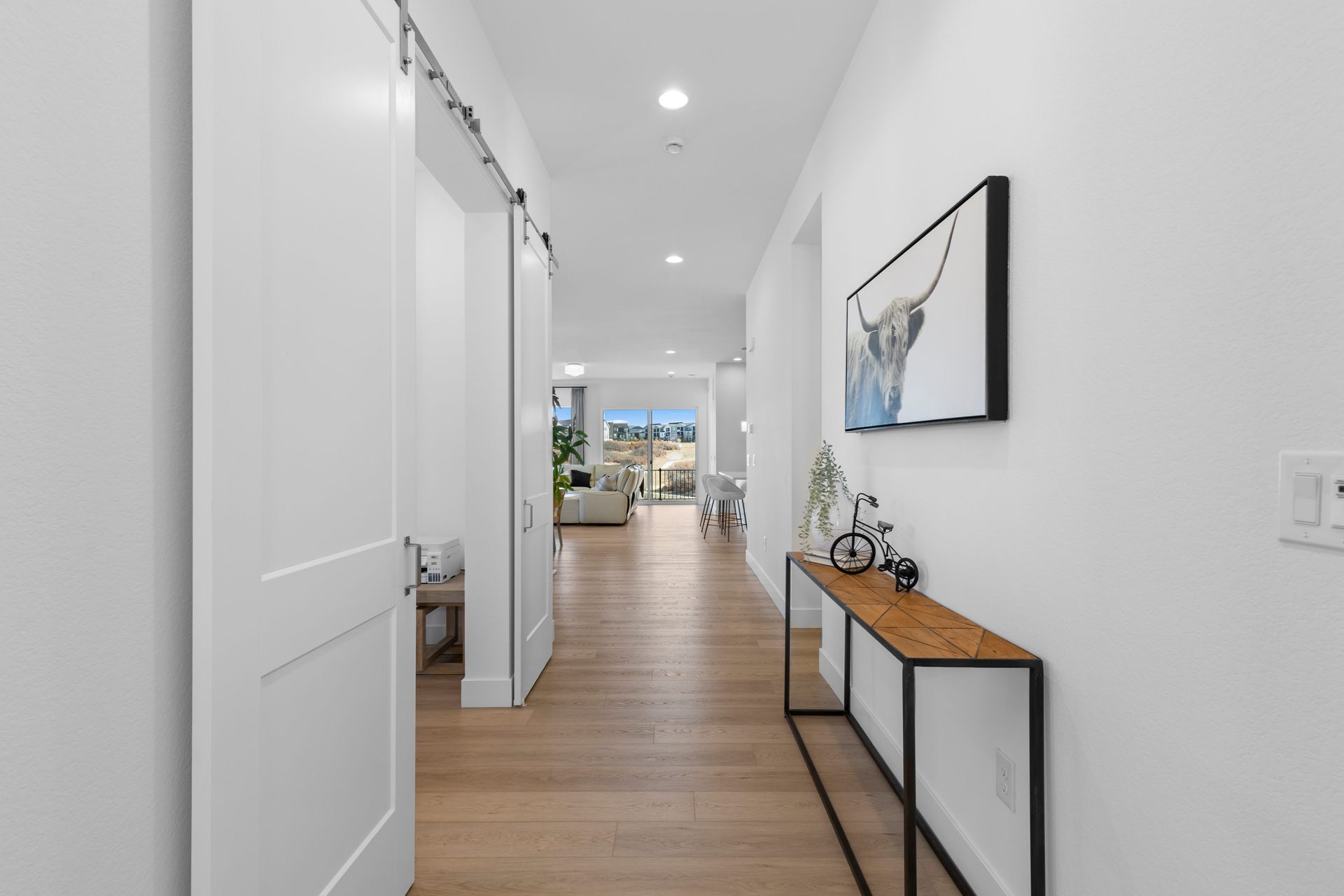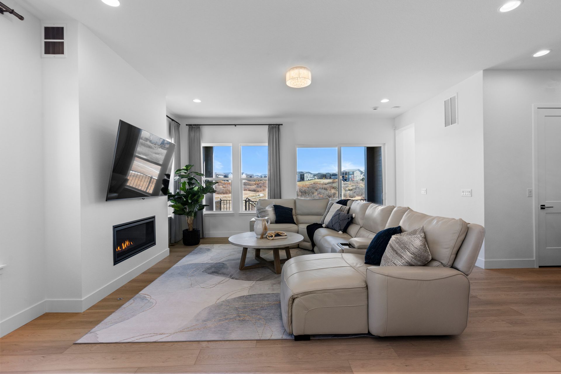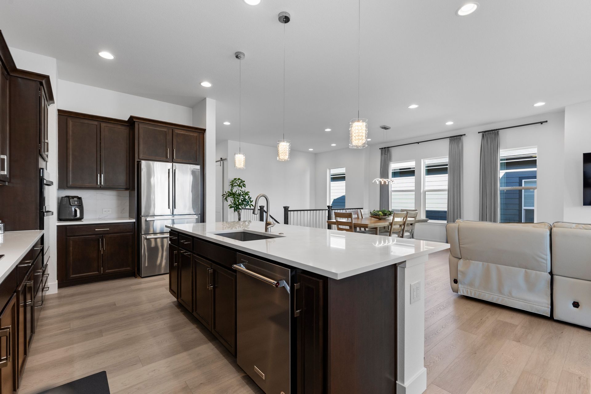 Welcome to this stunning, nearly new ranch by Shea Homes in The Canyons - where modern design meets the beauty of open space. With 4 bedrooms and 5 bathrooms, every detail of this home is crafted for effortless luxury and comfort. Inside, the open-concept main floor offers plenty of room to relax or entertain. The family room centers around a beautiful fireplace framed by large picture windows that fill the space with natural light and capture serene views of the open space beyond. Flowing seamlessly into the dining area and gourmet kitchen, this main living area is ideal for gatherings both large and small. The kitchen is a true showpiece - featuring sleek stainless steel appliances, quartz countertops, a large island with seating, a gas range with a designer hood, and abundant cabinetry for storage. A statement chandelier, custom window treatments, and an added guest suite create a welcoming flow of light and style. The versatile home office provides the perfect space for remote work or study. Each of the four bedrooms features its own private en suite bathroom, offering a rare combination of privacy and convenience for family and guests alike. The fully finished walk-out basement adds even more versatility, complete with a full wet bar and an additional en suite bedroom - perfect for guests, game nights, or a private retreat. Step outside to a backyard that backs directly to open space, offering peaceful views and a seamless connection to a scenic trail beyond the fence. The exterior is thoughtfully designed with an extended driveway, concrete side path, year-round green artificial turf, and a custom planter box. This Castle Pines gem combines modern luxury, smart design, and a rare open-space setting. With en suite bedrooms, a versatile home office, premium finishes, and a natural backdrop that feels miles from the city, it’s the perfect balance of elegance and ease. Experience fresh, elevated living in The Canyons!